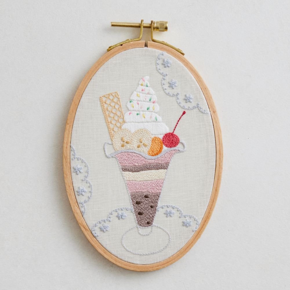 4作品目は、心満たされる「パフェ」と「小花模様のレースペーパー」です。 アイスたっぷりなご褒美パフェは、バニラ・チョコ・ストロベリーの3層のアイスの上に、フルーツとソフトクリームも!あると嬉しいウエハースも添えられています。作品に合わせて、刺しゅう枠も楕円型になっています。