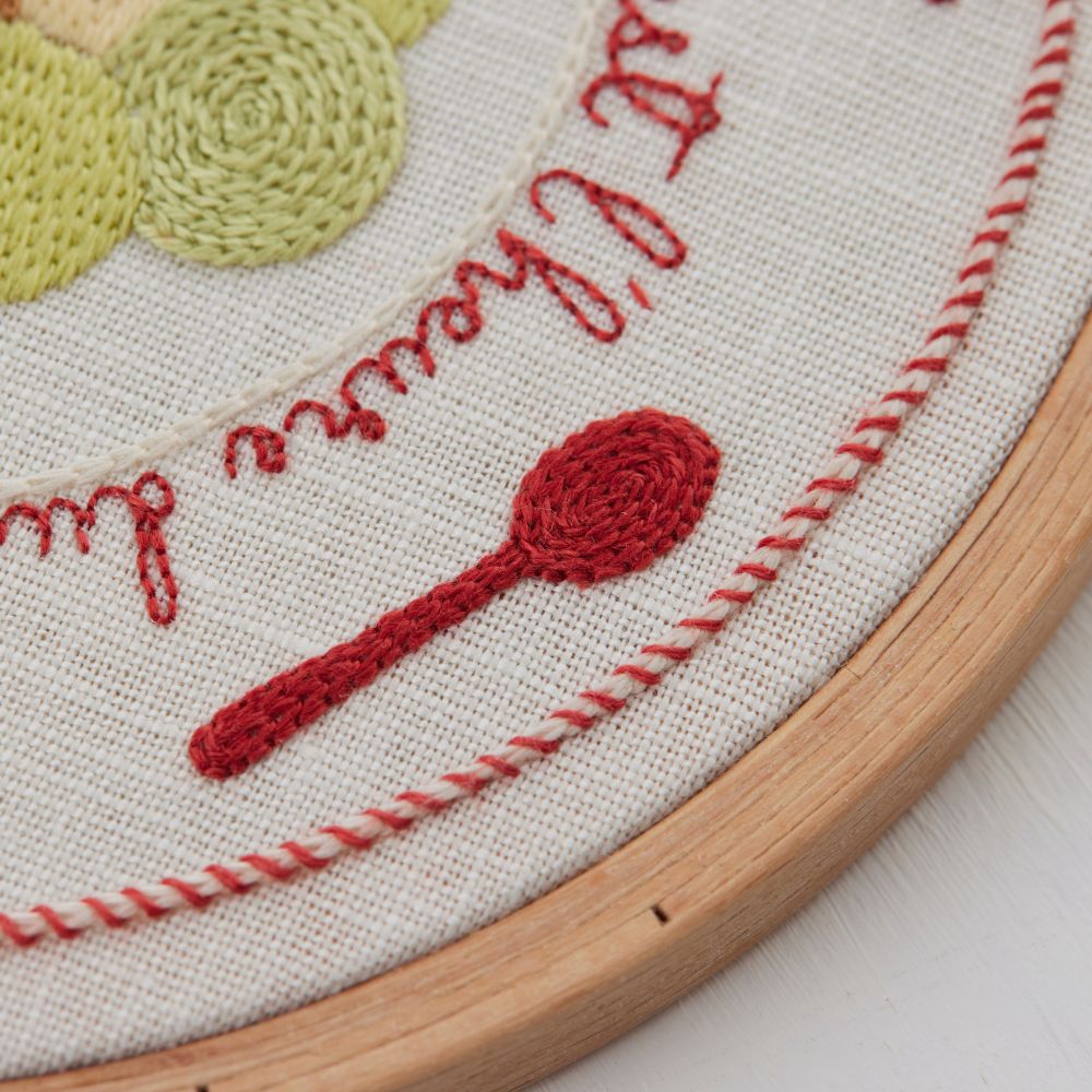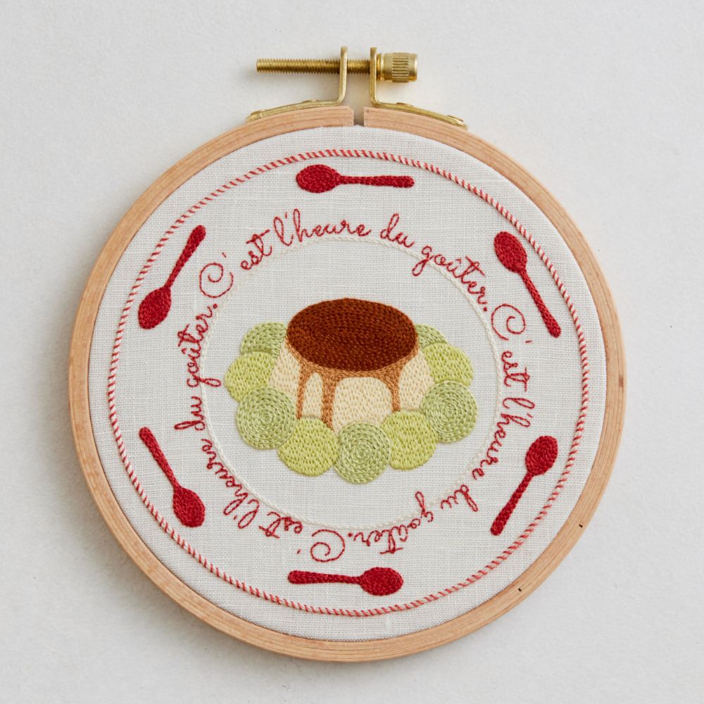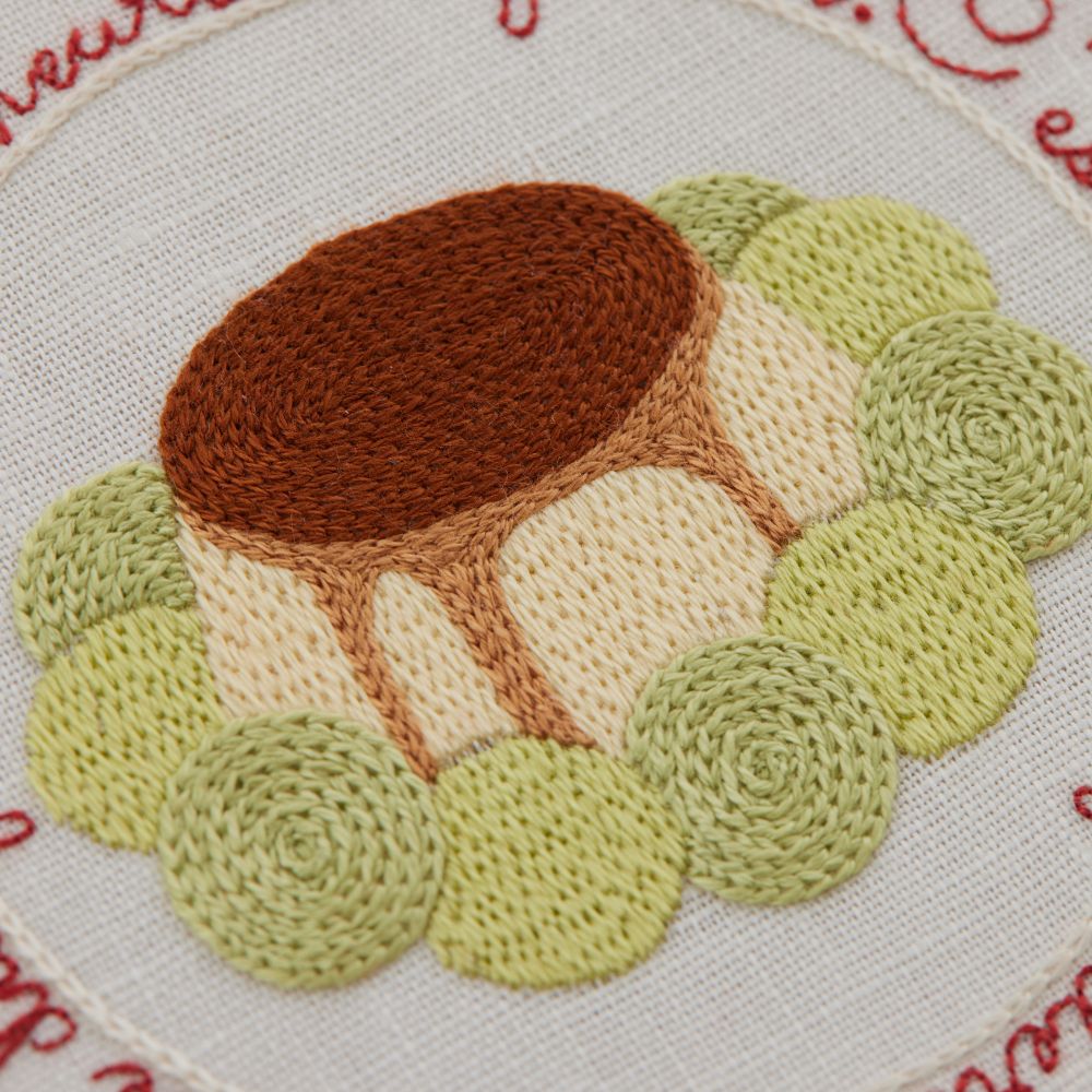スプーンの刺しゅうが可愛らしいお皿には、フランス語で「おやつの時間です。」という文字も描かれています。カーブが多いので、細かくステッチしてなめらかに刺しゅうしましょう。