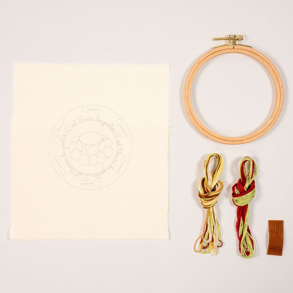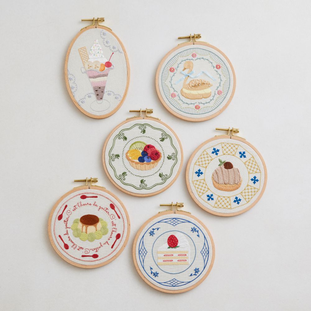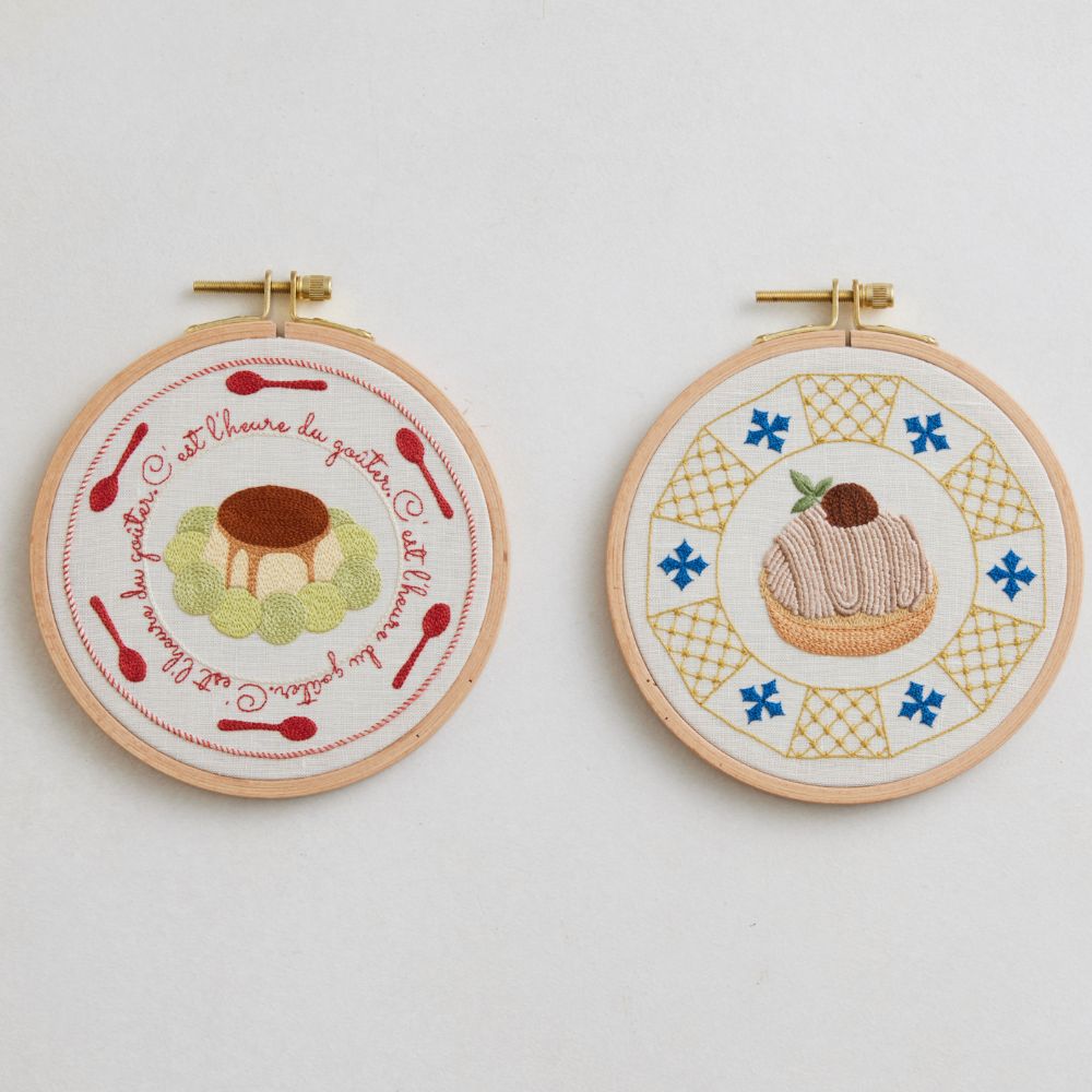 bitteさんのInstagramで、年間のテーマを決めて月ごとにモチーフを作る「マンスリー刺しゅう」という企画で2022年に投稿されていた「お菓子とお皿」をもとにした、スイーツとお皿の刺しゅうをお楽しみいただけるキットになっています。