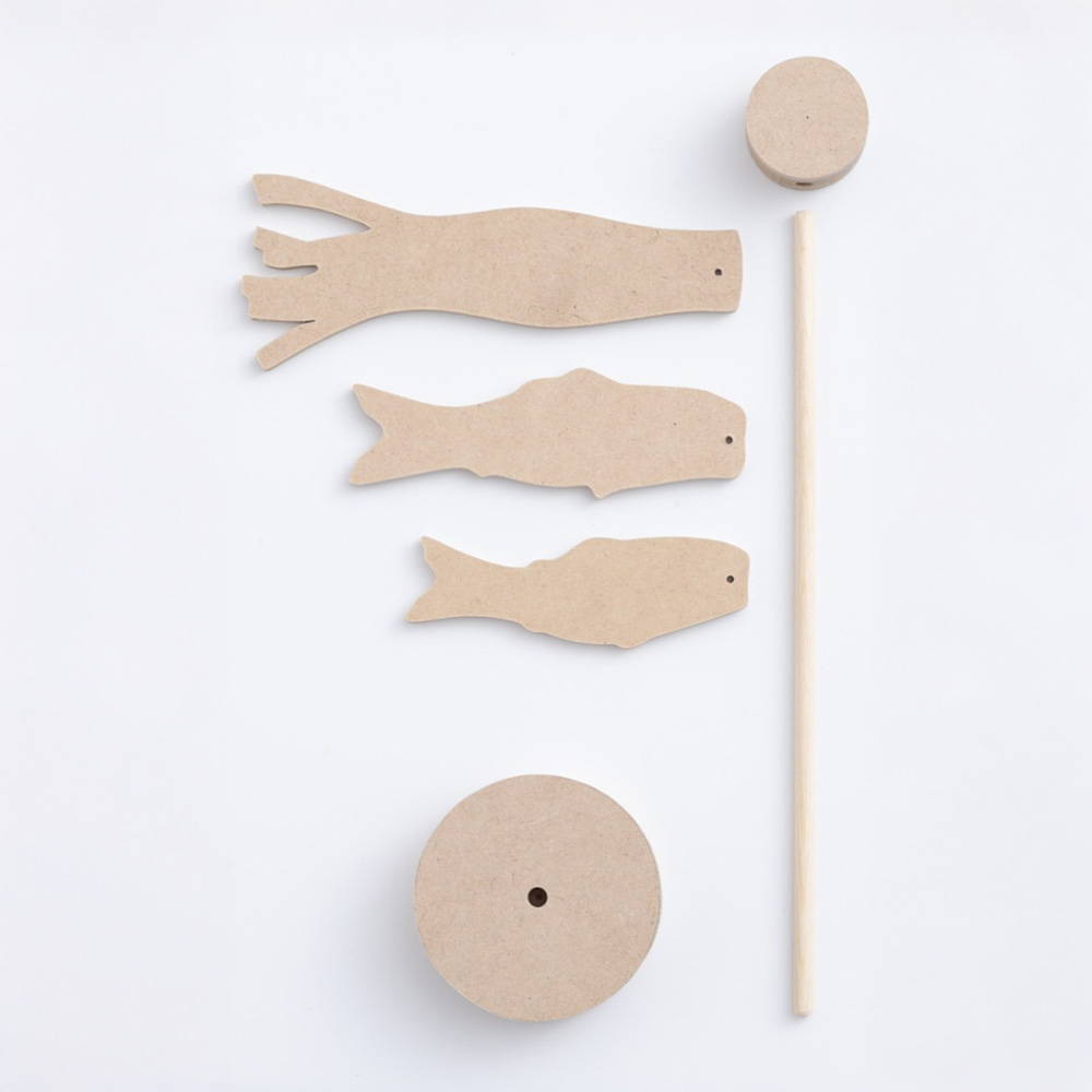 真鯉:縦3.5×横10×厚さ0.4cm、緋鯉:縦3×横8.5×厚さ0.4cm、吹き流し:縦5×横12.5×厚さ0.4cm、矢車:φ3×厚さ1.8cm、ポール:φ0.5×長さ20cm、台座:φ6×厚さ1.8cm