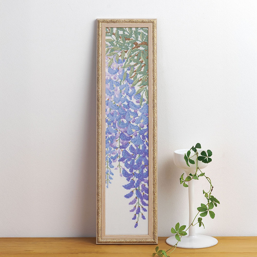 【キット作り方つき】【フレームつき】 藤の花を大胆に縦長フレームにレイアウトしました。紫のグラデーションが美しいクロスステッチ作品です。中級の方向け。
