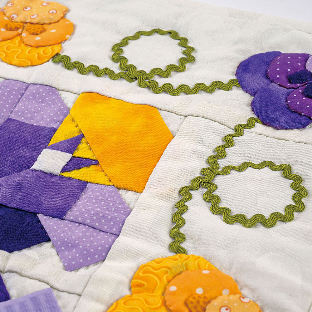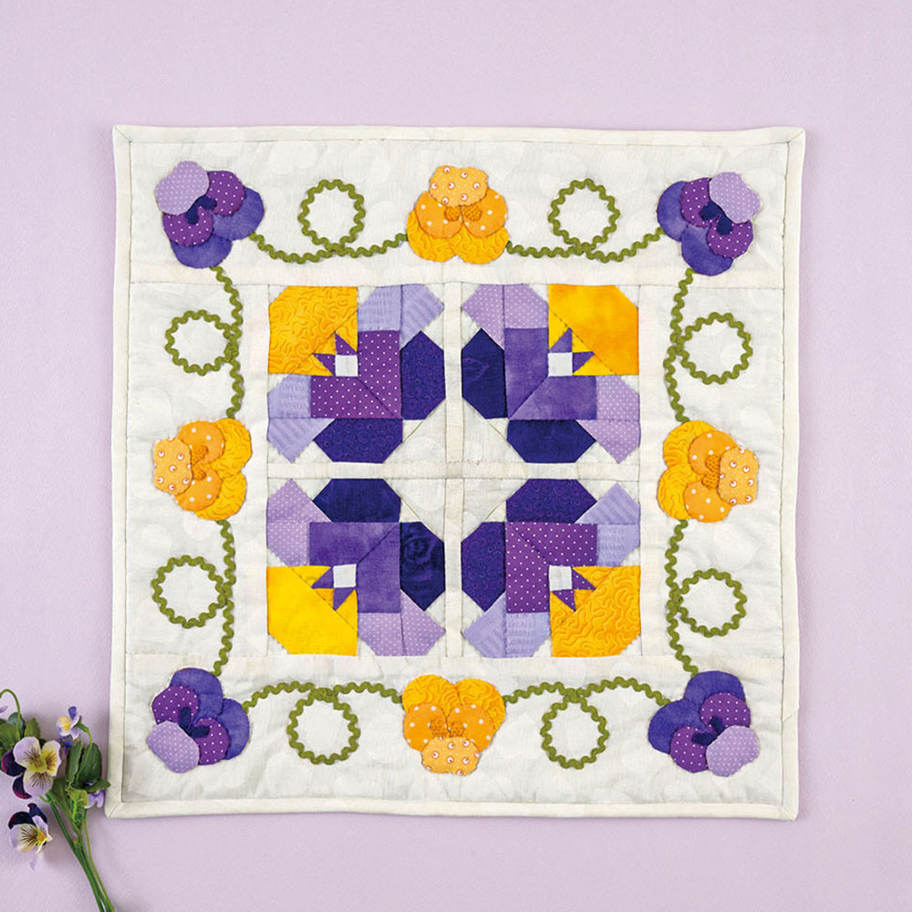 【キット作り方つき】ピースワークとアップリケのパンジーが楽しめるタペストリー。山道テープで動きをつけました。紫と黄色でお部屋が明るくなります。