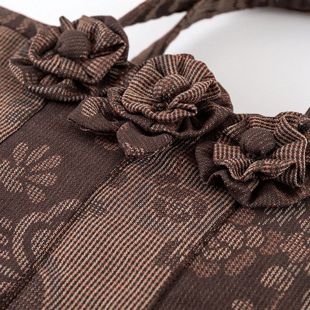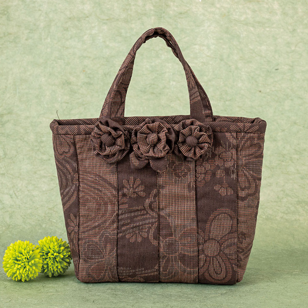 【キット作り方つき】大島風のプリント布をピースワークした小ぶりで使いやすいバッグ。共布で作る立体のお花がポイント。後ろ側は花飾りなし。