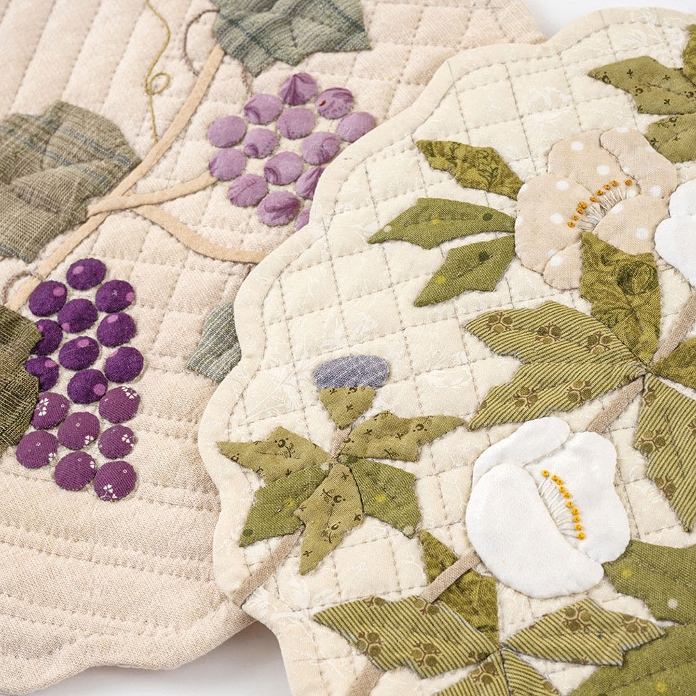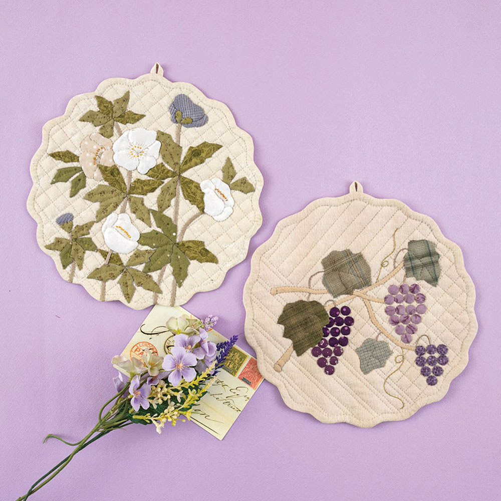 【キット作り方つき】クリスマスローズとブドウ園をイメージしたタペストリー2種セットです。カーブのラインで柔らかいイメージに仕上げました。ループを裏につけたボタンに掛けてつなげて飾れます。