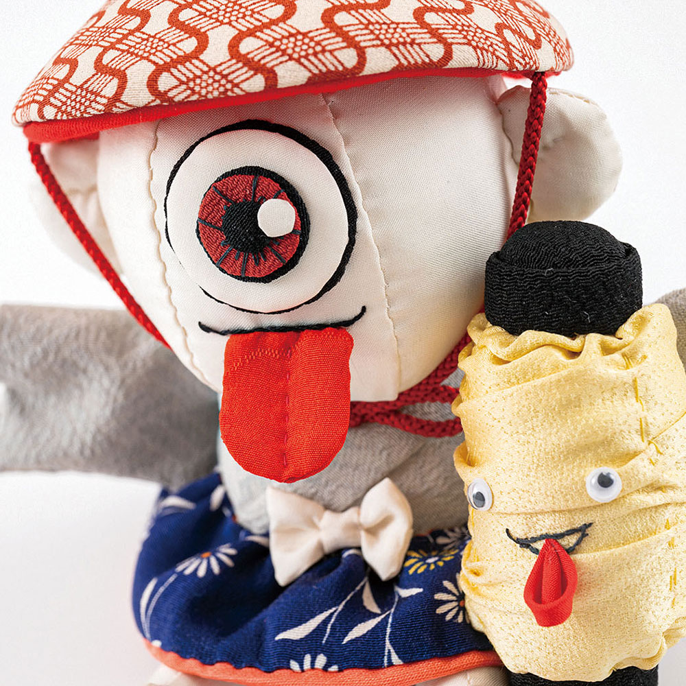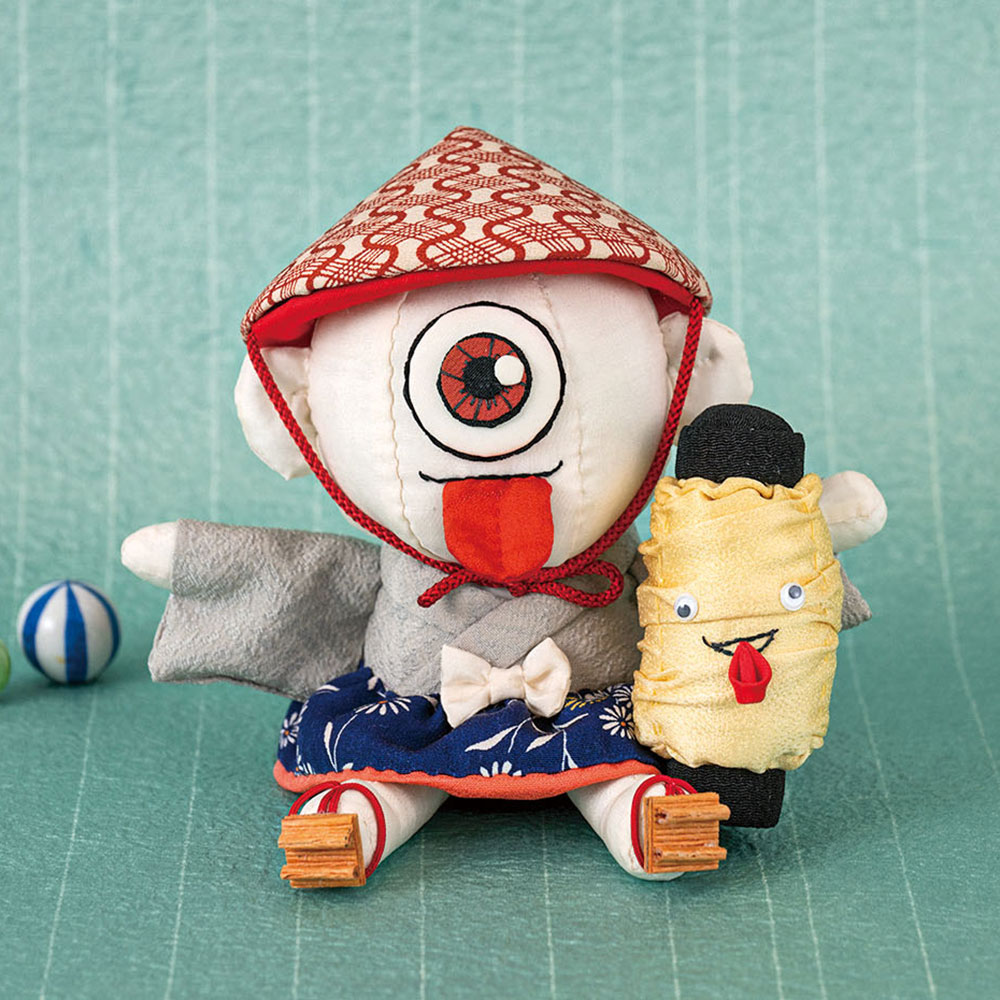 【古裂・キット作り方つき】一つ目小僧と相棒の提灯君です。可愛い妖怪ができました。インパクトある目は押絵の技法と刺しゅうで。下駄も作ります。