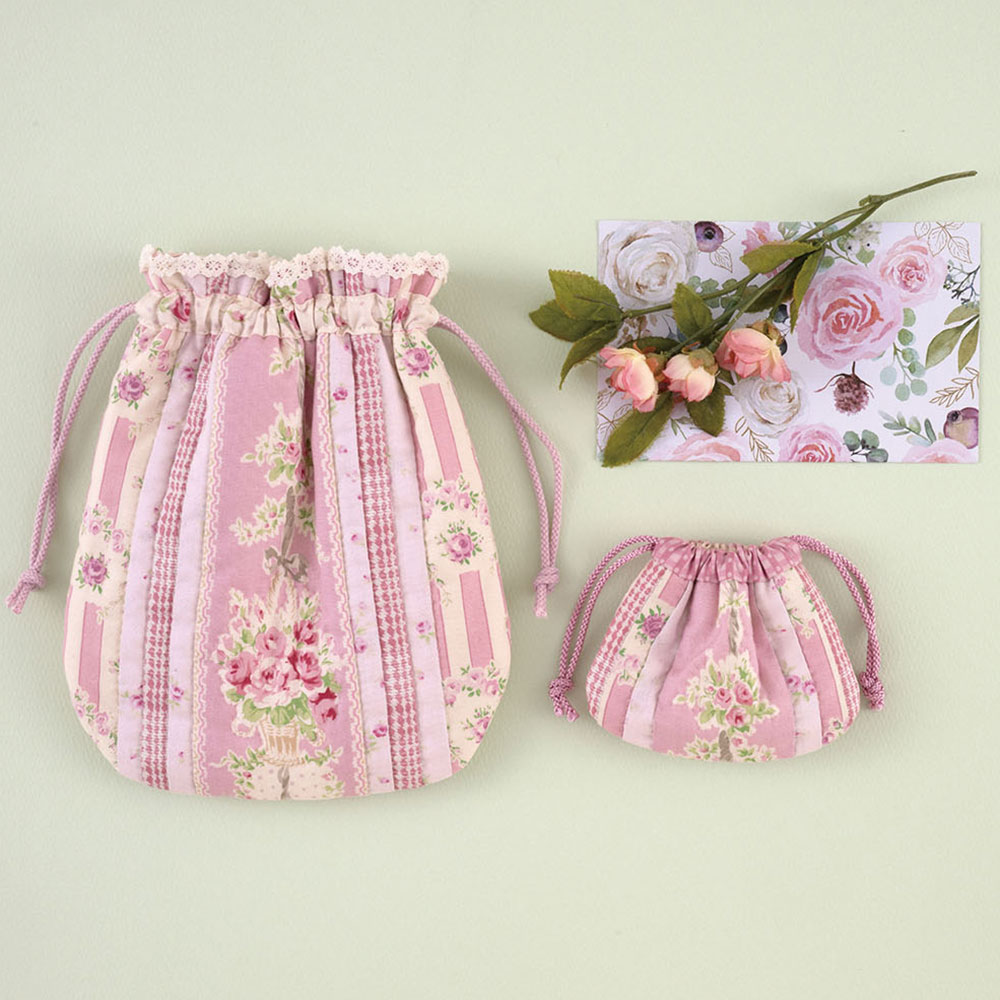 【キット作り方つき】スマートフォンが入るサイズの巾着と小さいサイズのミニミニ巾着のセット。ピンクの花柄をつなげて作ります。