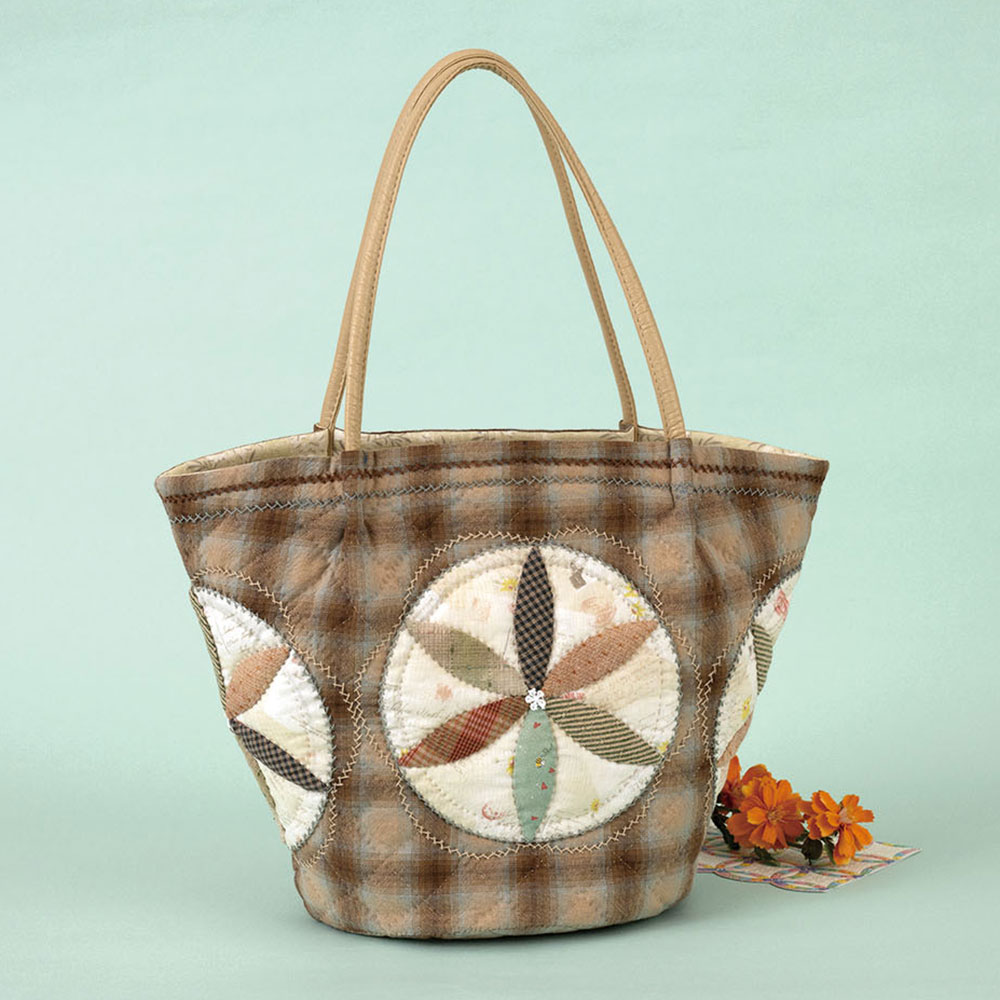 【キット作り方つき】前後左右にアップリケをした丸底のトートバッグ。口が大きく、肩掛けできる持ち手で便利に使えます。