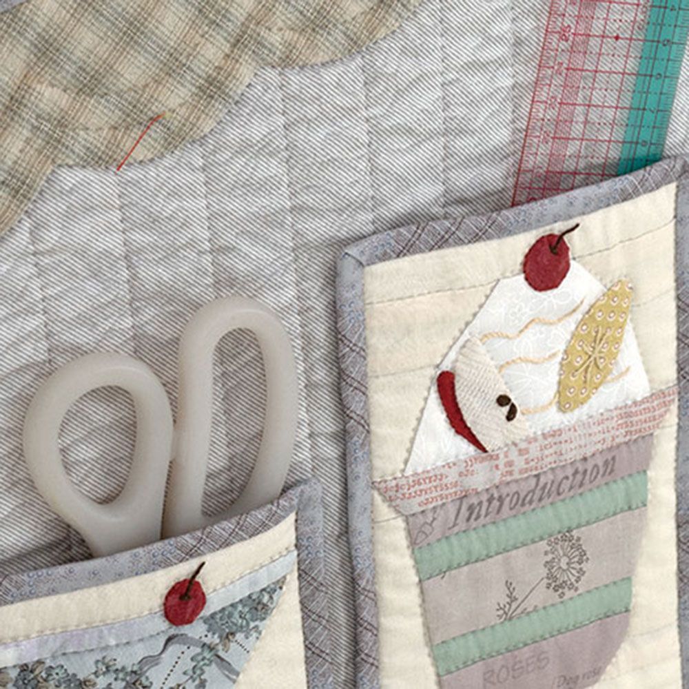 【キット作り方つき】おいしそうなフルーツパフェやゼリーをポケットにピースワークとアップリケでデザインしました。定規やはさみなどを入れておけば、すぐに取り出せ便利です。お部屋が可愛らしくなります。