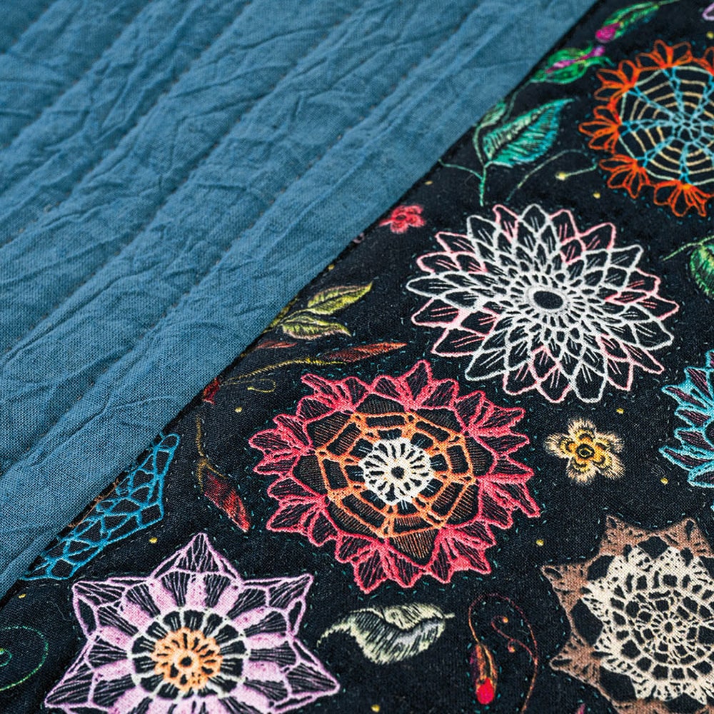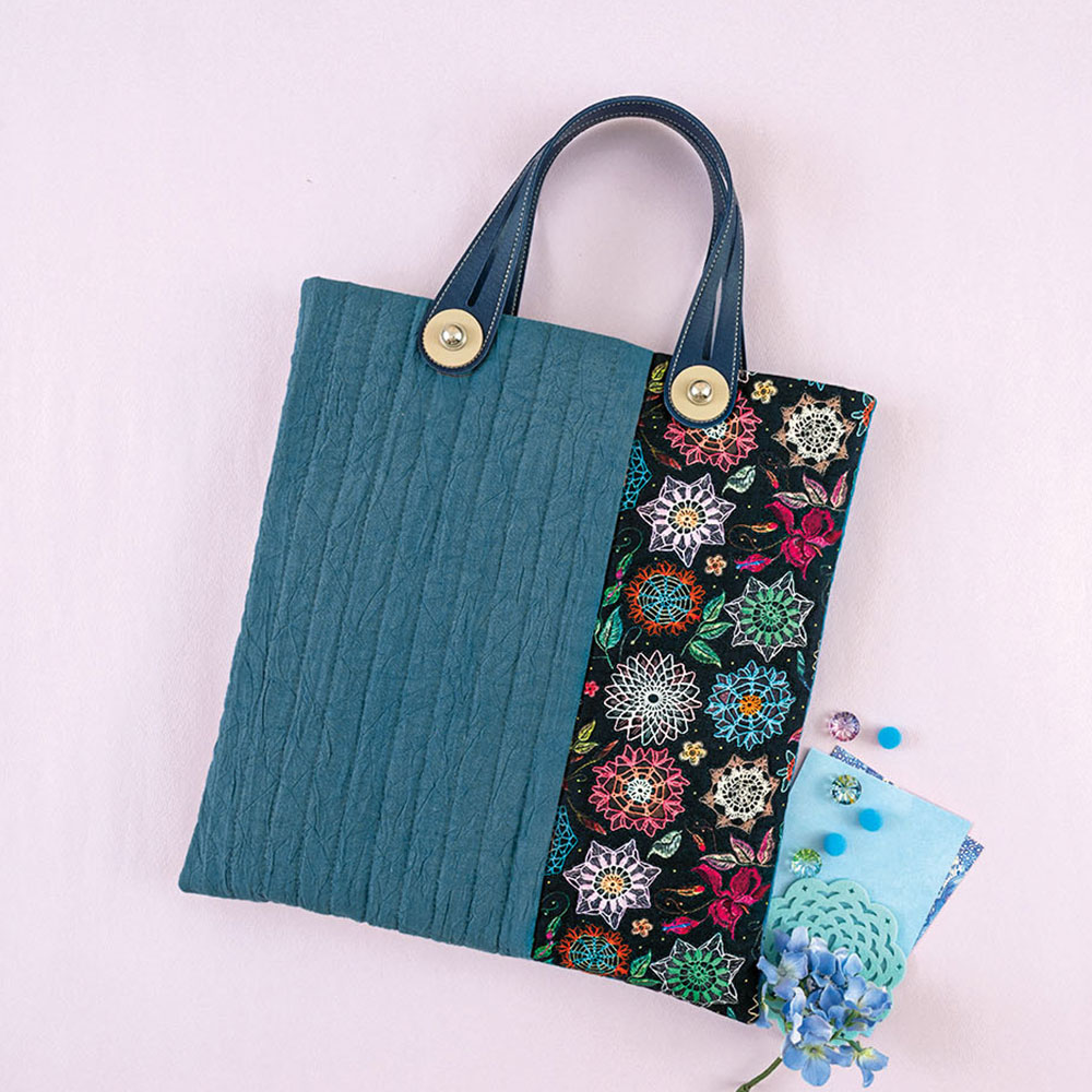 【キット作り方つき】厚手しわ加工布にモチーフ編がプリントされた布を合わせてペタンコバッグにしました。反対側も同じデザインです。