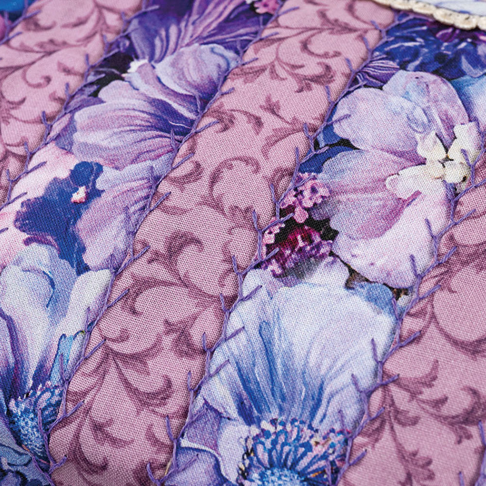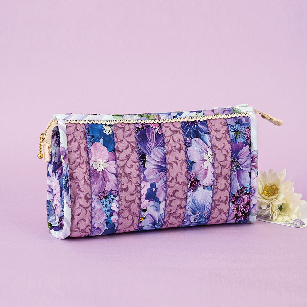 【キット作り方つき】ラベンダーカラーの印象的な布を使ってでポーチにしました。レースもつけてエレガントな雰囲気です。反対側も同じデザイン。