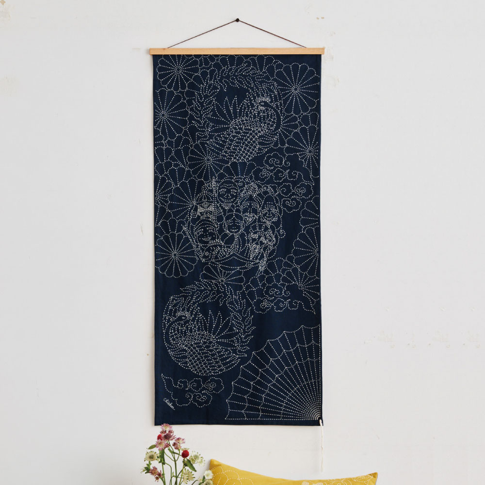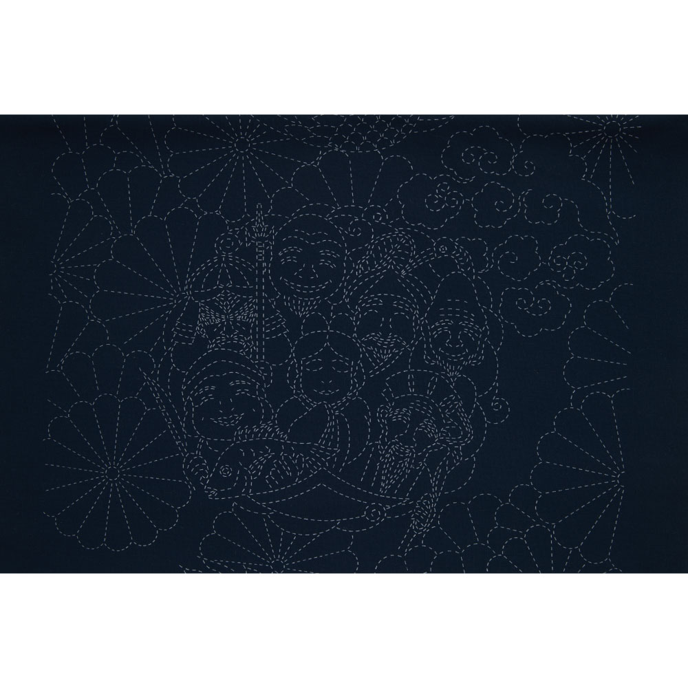 福を招く縁起物として、古くから日本の暮らしに根付いているモチーフを集め、背景に吉祥文をあしらった、お祝いづくしの刺し子布です。水で消える図案がプリントされています。