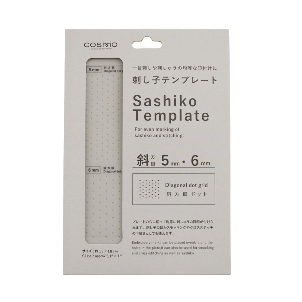 一目刺しや刺しゅうの均等な印付けに便利なプレート。プレートの穴に沿って均等にステッチの目印がつけられます。薄い半透明のシートなので、下の布が見やすく、印を付けやすくなっています。5mmと6mm間隔の穴が斜め30°の角度で並んでいます。