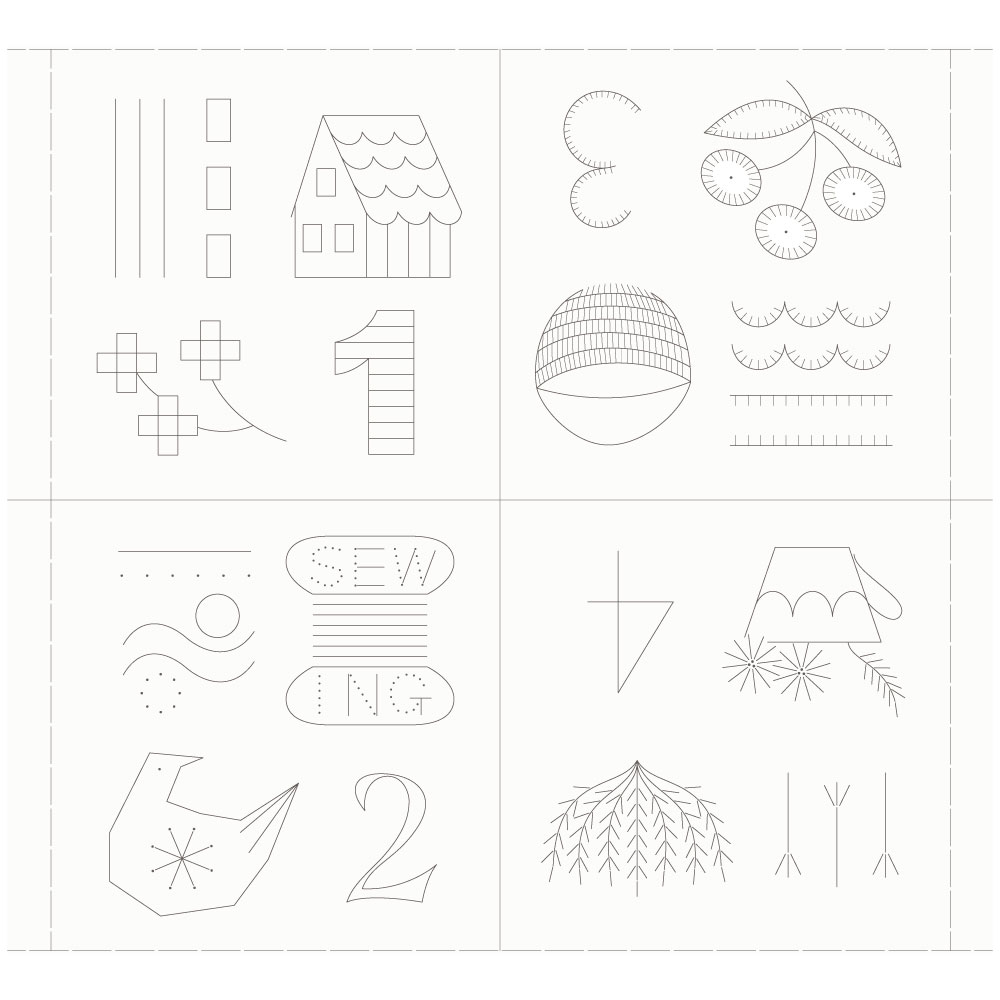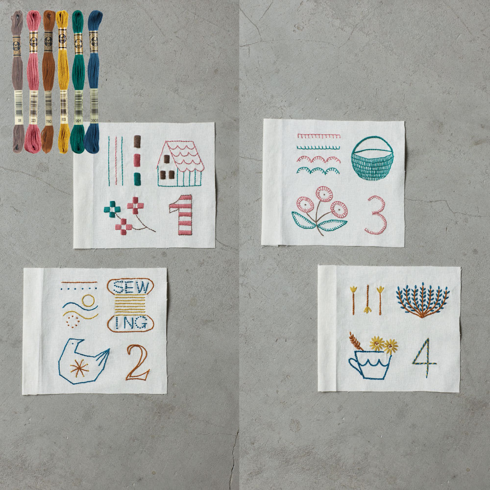 ステッチイデーvol.48 6~7ページのステッチサンプラーが作れる材料セット。図案印刷済みのソフトリネンコットンキャンバス布とDMC25番刺しゅう糸のセットです。