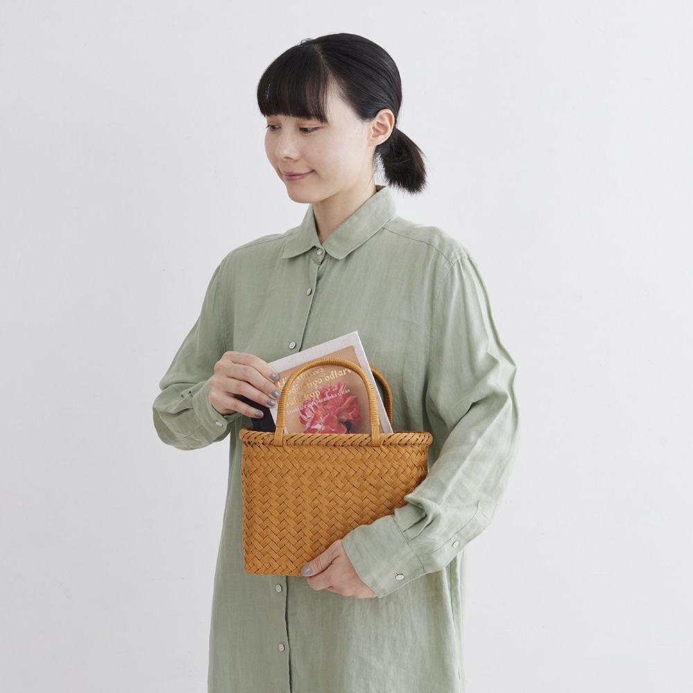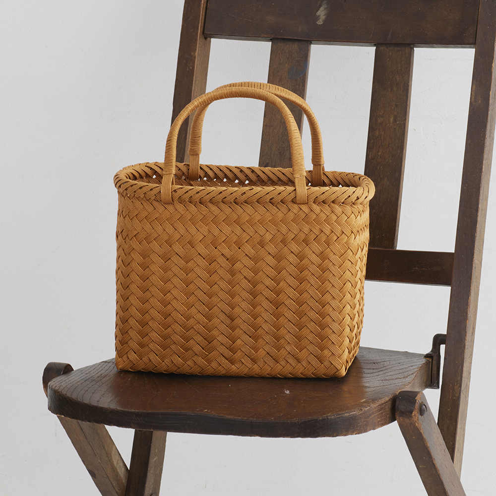 目をずらしながら編んでいく網代編みのかごバッグは、かご口の縁に変化をつけました。