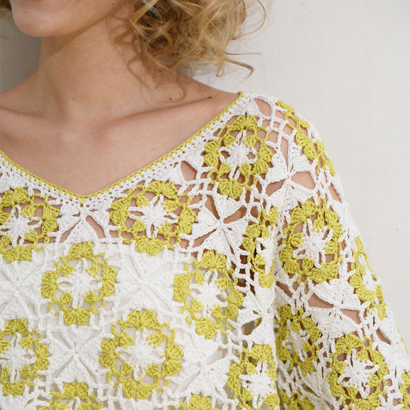 元気が出るライムイエローが印象的なモチーフを斜めに配置して動きを出しました。衿ぐりはVネックでシャープに、裾はラウンドスリットで柔らかさをプラスしています。モチーフをつないで生まれる模様も魅力的です。