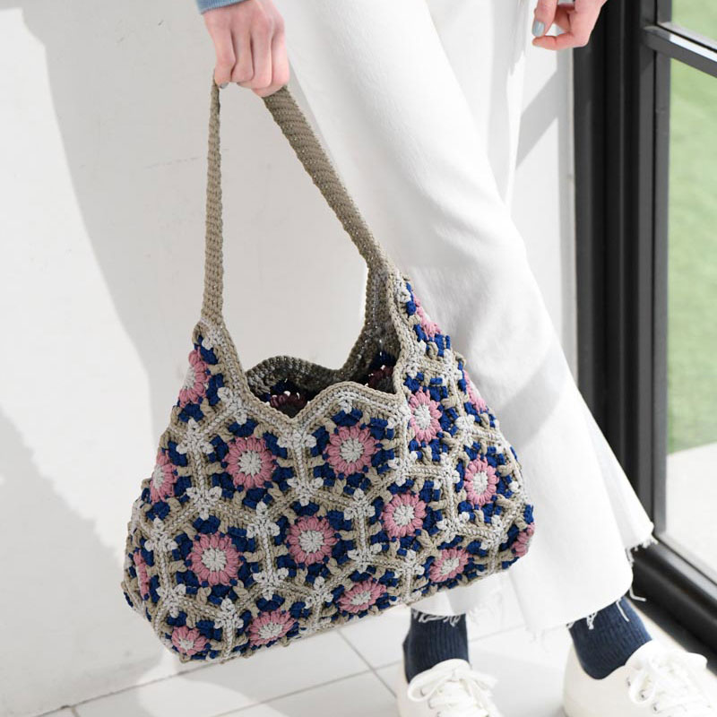 スポンジッシュな糸で編むモチーフは、とっても軽い!バッグにぴったりの密なモチーフも、軽くしっかり仕上がります。玉編みや引き上げ編みを使ってかちっと編んだモチーフバッグは、中袋なしでも大丈夫。モチーフの最終段を編み込みにすることで新鮮な表情になります。