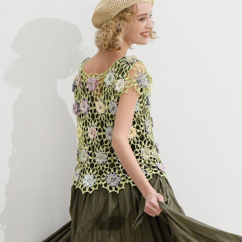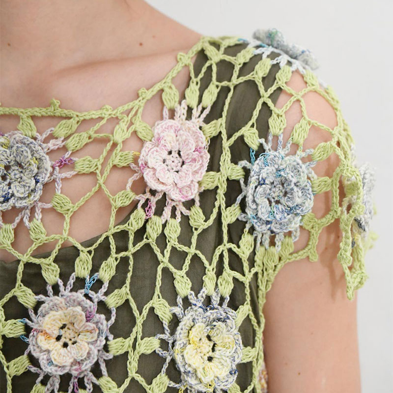 花畑をまとうような可憐なモチーフつなぎ。立体的な中心の花モチーフは穏やかに変化するロングピッチの段染め糸を使っているので、配色しなくてもいろんな色が楽しめます。最終段をグリーンでまとめることで、つないだときに葉っぱと蔓のように見えてきます。