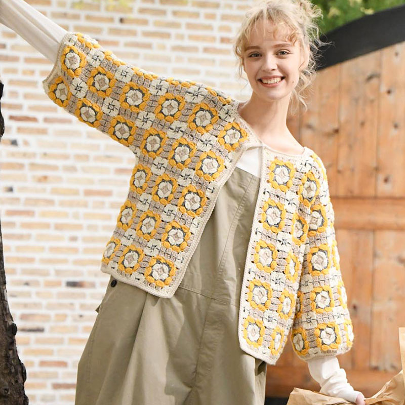 玉編みの使い方がテクニカルなモチーフつなぎはグラフィカルテイストな仕上がり。中心の花からつなぎ方まで、モダンで新鮮な印象です。変形モチーフなしだから、気負わずチャレンジしてみて。肌触りのよいシルク混紡のウール糸で編めば、長い期間楽しめます。