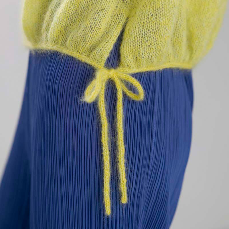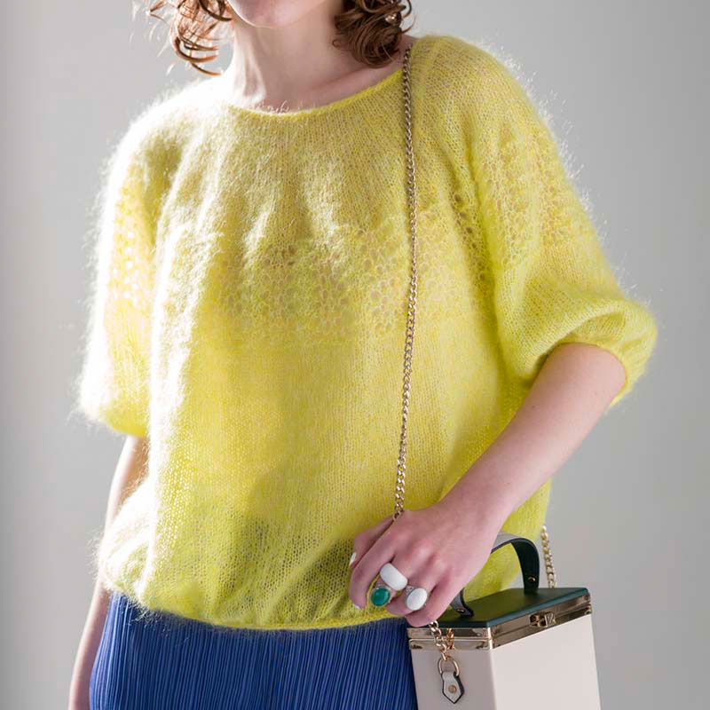 アイコードで絞った袖口&裾のシルエットがチャーミングな丸ヨーク。鮮やかな春色カラーが映える、上品な光沢もモヘアヤーンの推しポイントです。胸元に入れた穴あき柄も毛足のおかげで程よい透け感が楽しめます。