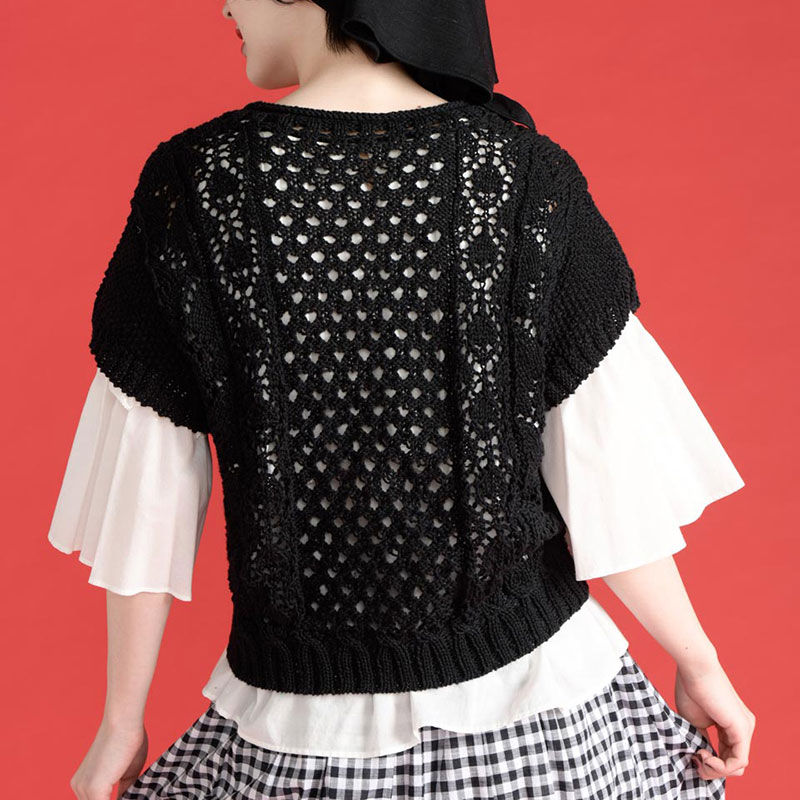 センターにV字に入れた透かし模様がインパクト大。重ね着で長く着られ、ボトムを選ばない万能アイテムになりそうです。