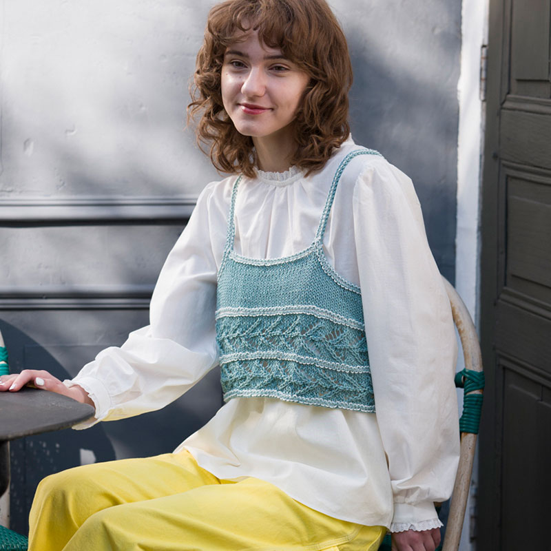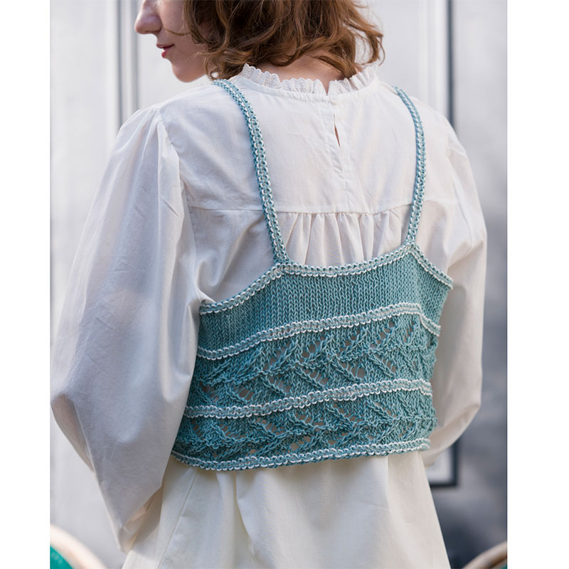 今シーズン、たくさん着回したい透かし模様のキャミソール。ピコットリボンのように見える肩ひもや模様の境は、ガーター編みならではのシンカーループの流れと配色の賜物です。