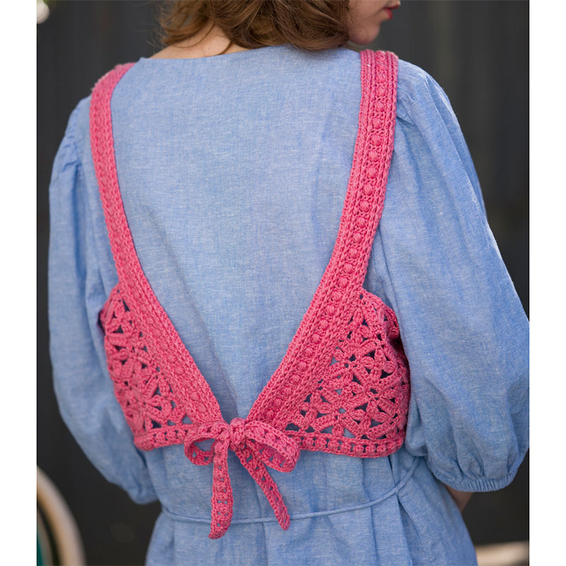 玉編みと長編みの立体的な模様のビスチェは、ビビッドカラーで編んでおしゃれの差し色に。見慣れた服にレイヤードすれば、遊び心がプラスされたいつもと違うスタイルの完成です。