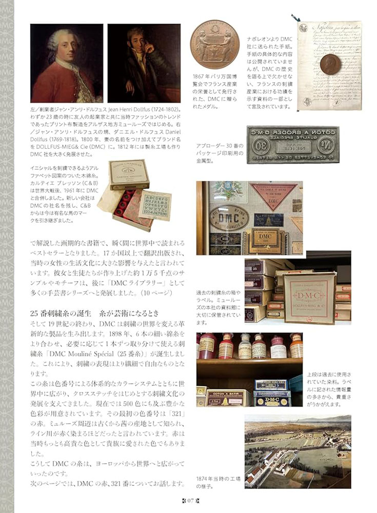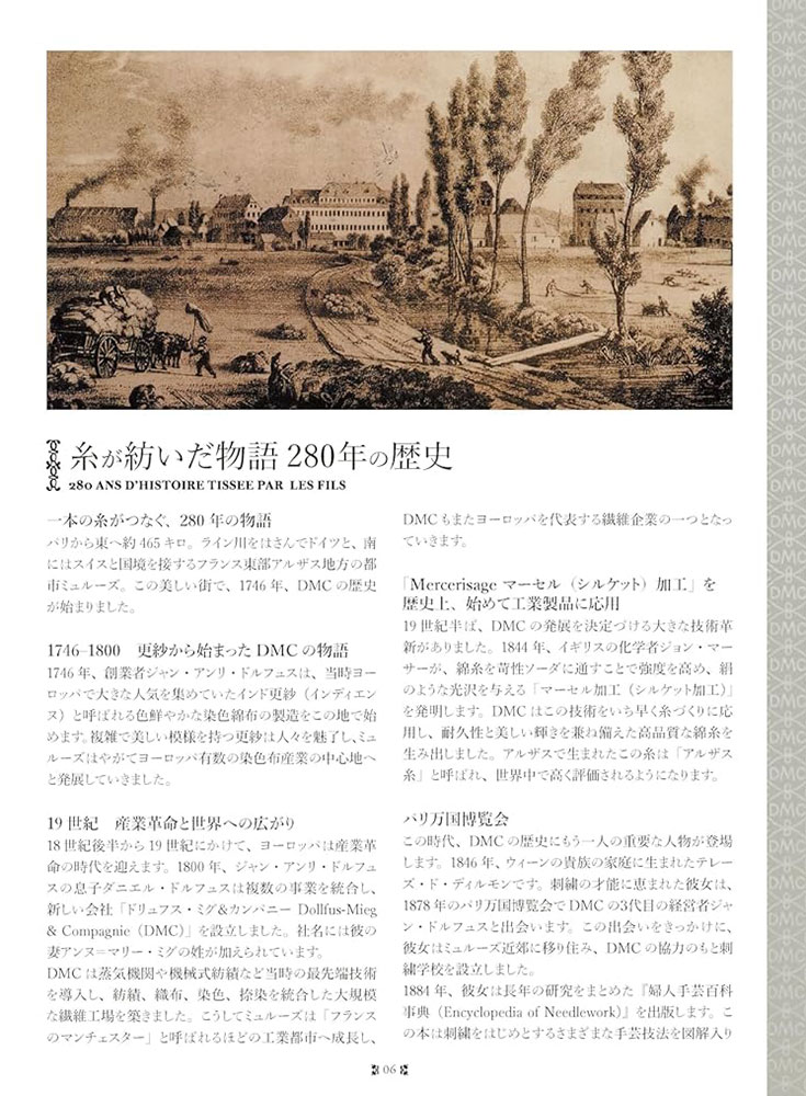 フランスの手芸メーカーDMC社の創業280年を記念して、DMC社の歩みと刺しゅうの魅力を伝える本。豊富な過去のアーカイブから歴史を紹介すると共に、テレーズ・ディルモンさんが残したクロスステッチの図案を復刻します。歴史の香りのする作品と共に、特別付録の図案集もお楽しみください。