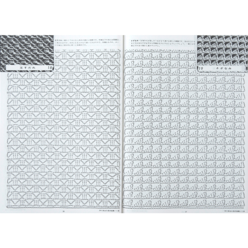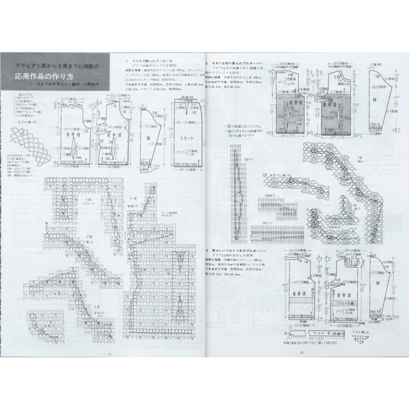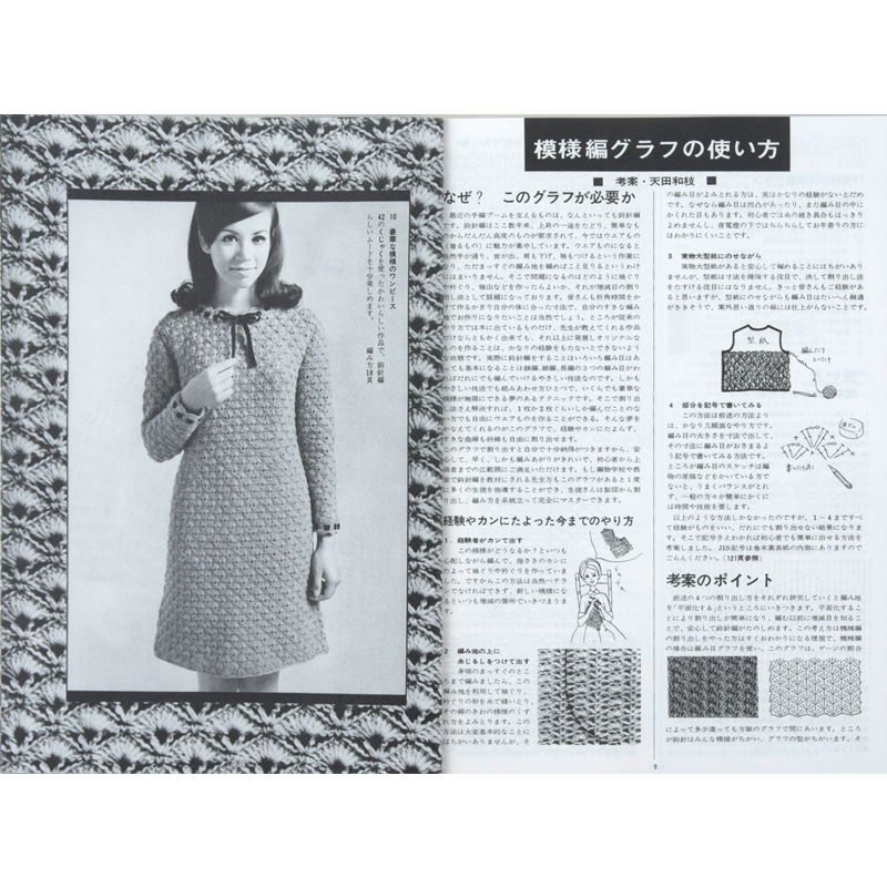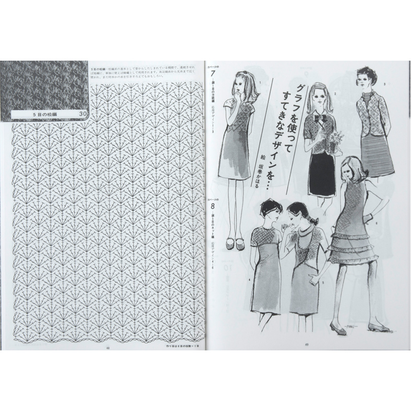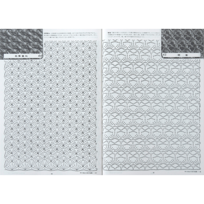 長編、細編、長細編をはじめ、方眼編はネット編など、かぎ針編の基本編み目を中心に、やさしい模様、使いやすい模様を70点掲載。そのほか、模様をいかした雰囲気たっぷりのスタイル画192点が紹介されています。