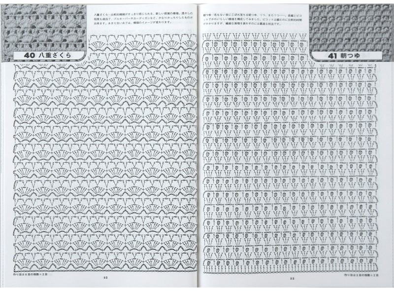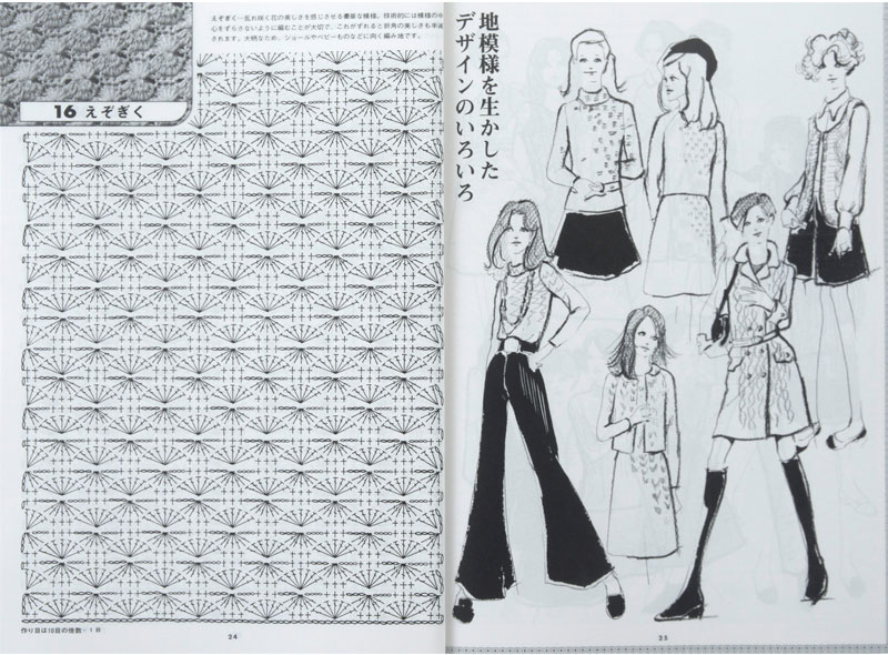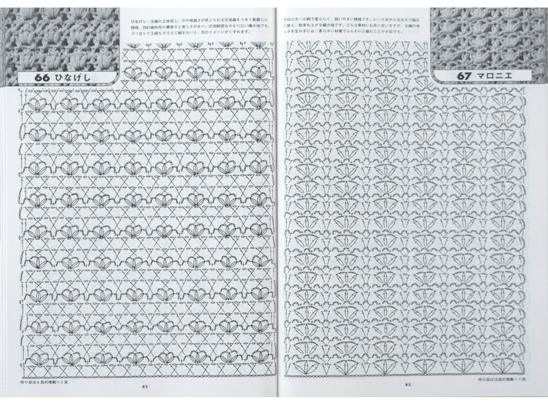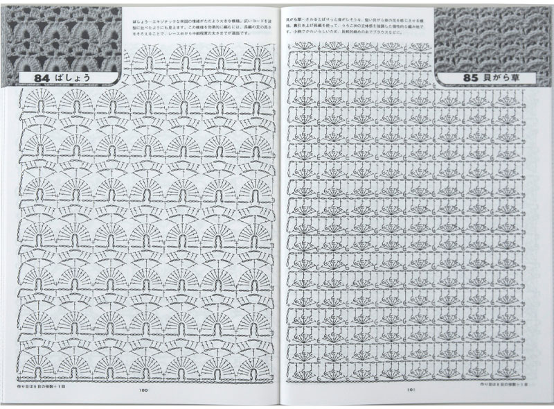 長編、細編、長細編をはじめ、方眼編はネット編など、かぎ針編の基本編み目を中心に、やさしい模様、使いやすい模様を100点掲載。そのほか、模様をいかした雰囲気たっぷりのスタイル画が紹介されています。模様ごとに付けられた名前や、添えられたワンポイントを見るのも楽しい。