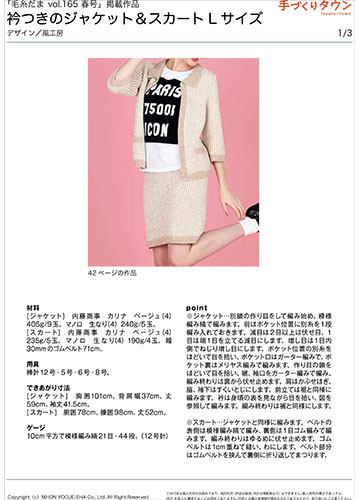 材料:[ジャケット] 内藤商事 カリナ ベージュ(4)405g/9玉。マノロ 生なり(4)240g/5玉。 [スカート] 内藤商事 カリナ ベージュ(4)235g/5玉。マノロ 生なり(4)190g/4玉。幅30mmのゴムベルト71cm。