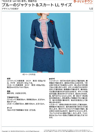 材料:[ジャケット]内藤商事 カリナ 青(9)500g/10玉。ギアダ 水色(21)50g/1玉。 [スカート]内藤商事 カリナ 青(9)450g/9玉。幅25mmのゴムベルト73cm。