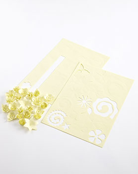 細く切った紙のリボンをクルクルと巻いて、その渦の美しさを活かしながら、好きな形を作っていくペーパークイリング。10種類のお花を手軽に作ることができる、あらかじめ切り目を入れたペーパーです。切り目の入った紙から図案を抜き取り、巻いて立体にすることで素敵なお花ができ上がります。違う形の花びらを重ねると、いろいろな表情のお花を楽しむことができます。