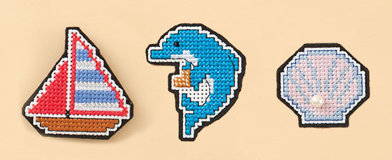 あべまりさんのクロスステッチキット マリンテイストのブローチ3点セット[ヨット・イルカ・貝]