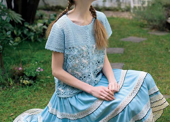 材料:リッチモア スビンゴールド<テープ> 水色(126)265g/9玉、生なり(102)10g/1玉。スビンゴールドテープ<プリント> 水色系段染め(216)40g/2玉。直径10mmのボタン7個。