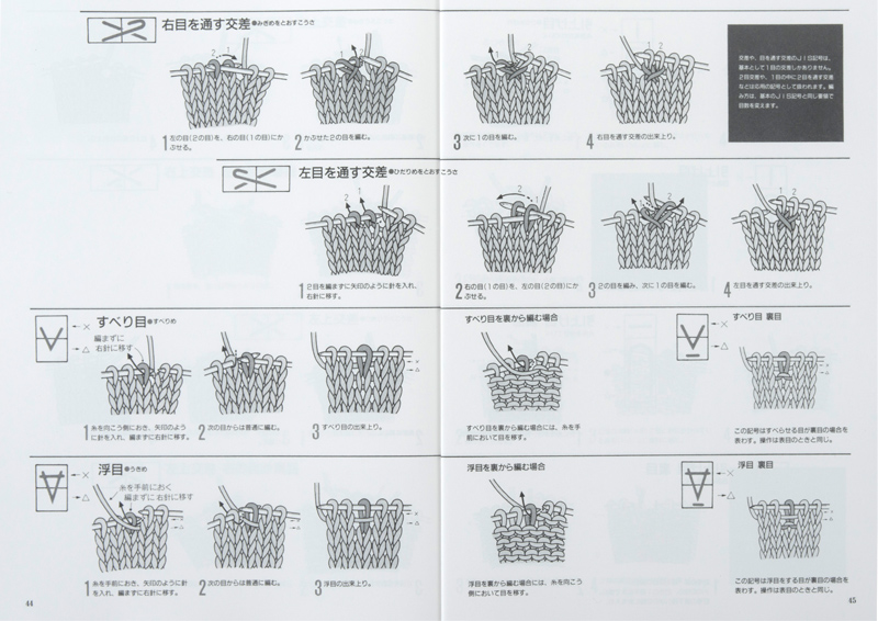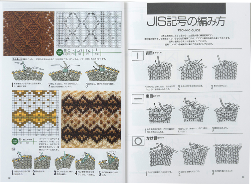 模様を編むために欠くことのできない、様々な編み目記号の編み方と効果的な使い方を紹介しています。