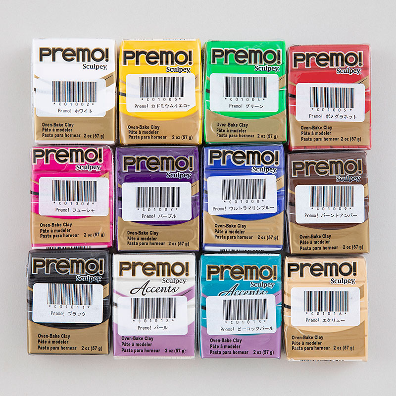 クレイクチュール講座の基本12色がセットになっています。(ホワイト、カドミウムイエロー、グリーン、ポメグラネット、フューシャ、パープル、ウルトラマリンブルー、バーントアンバー、エクリュー、ブラック、パール、ピーコックパール)