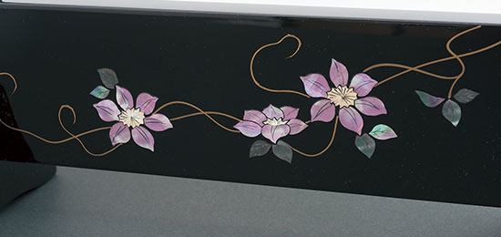 アワビ階のように、貝殻裏面の真珠層と言われる虹色部分を.1mmの薄さにし、彫刻された木地の表面にはめ込む技法。主に漆器や帯などの伝統工芸に用いられる装飾技法のひとつで、正倉院御物にも遺されている。