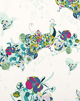 絹のような風合いのピマコットン。オフホワイト地に、色鮮やかなクジャク柄をプリントしました。クッションやバッグに、また好きな色の部分で小物を作っても。