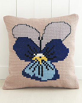 【キット作り方つき】 大きく一面に描かれたパンジーが印象的なデザインのクッション。初級の方へ。