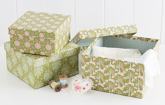 【完成品】 柄もサイズも異なる、3種類の紙箱セット。入れ子で収納できます。