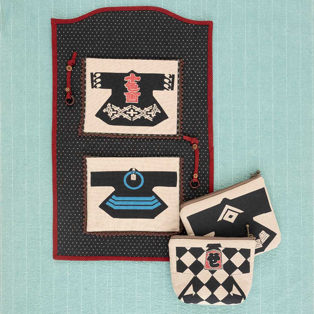【法被を並べた粋な柄。そのままタペストリーやのれんとして、また小さめの柄サイズを生かして小物にも。法被サイズ約縦10×横14cm。