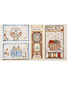 手づくりのイメージをステンシル風に描いたプリントパンル。ボーダーをつけてタペストリーに、またモチーフを切り取って使っても。