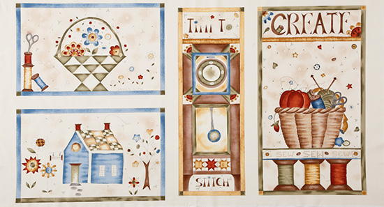 手づくりのイメージをステンシル風に描いたプリントパンル。ボーダーをつけてタペストリーに、またモチーフを切り取って使っても。