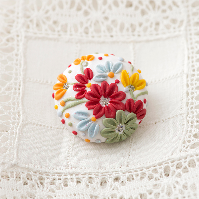 クレイ(フロストホワイトグリッター、ポメグラネット、スパニッシュオリーブ、コバルトブルーヒュー、カドミウムイエロー)、コンディショニングクレイ、シャワーカン付ブローチ、ストーン
