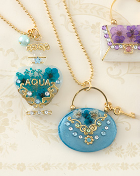 UVクラフトレジン液で作る、バッグとパヒュームボトルのミニチャームセット。メタリックシールや押花などを使ってゴージャスに仕上げます。 制作に必要な道具/はさみ、つまようじ、ピンセット、平やっとこ、ニッパー、カッターナイフ、ピンバイス(または桐など穴をあける道具)