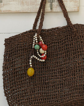 ~伊藤浩史と稲田京子のバッグとチャーム~ エチオピアンチェリーと呼ばれる、大きめなボヘミアンビーズをアクセントにした、存在感のある2本のチャーム。金具を使わず、蝋引きの麻紐を指で編んで玉どめを作るので、自然な風合いに仕上がります。すべてのパーツをひとつにつなげてネックレスにするのもおすすめ。簡単な作り方つきです。