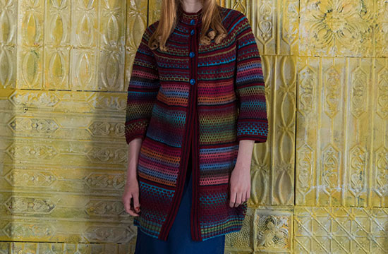 材料:ダイヤモンド毛糸 ダイヤカリーノ 緑・青・えんじ系段染め(6805)220g/8玉 ピンク・青・オレンジ系段染め(6804)115g/4玉 ダイヤタスマニアンメリノ えんじ(718)250g/7玉 紺(725)90g/3玉。直径18mmのボタン4個。