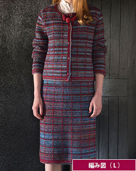 材料:[ジャケット]スキー毛糸 スキーマーゴ 青・赤紫系段染め(2038)280g/10玉 スキーツィードツィード 赤(6204)100g/3玉 緑(6207)70g/2玉、[スカート]スキー毛糸 スキーマーゴ 青・赤紫系段染め(2038)255g/9玉 スキーツィードツィード 赤(6204)75g/2玉 緑(6207)60g/2玉。直径18mmのボタン5個。幅30mmのゴムベルト76cm。