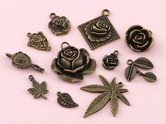 大小のバラとリーフを集めたアンティーク風チャーム。各2個ずつ計22個をセットでお届けします。