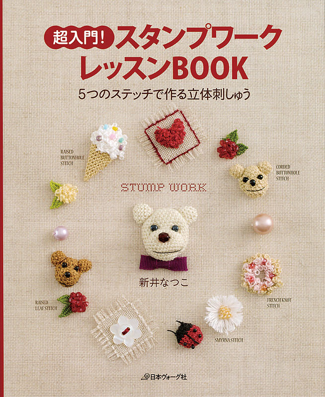 立体的なモチーフが特徴の刺しゅう、スタンプワーク。やってみたいけど、何だか難しそう…と思っていませんか? 実はスタンプワークは、刺し方に堅苦しい決まりはありません。レイズドボタンホールステッチ・フレンチノットステッチ・レイズドリーフステッチ・スミルナステッチ・芯入りボタンホールステッチ、この5つのステッチを覚えればスタンプワークならではの立体刺しゅうが楽しめます。立ち上がった葉のついたベリーやサクランボ、ぬいぐるみみたいなクマの顔など、いくつかのステッチを組み合わせることでさらに表現が広がります。難しく考えずに、小さくてかわいいモチーフから一緒に作ってみましょう。